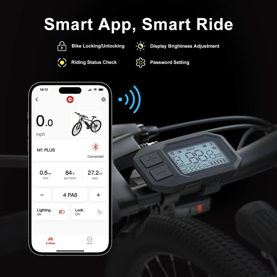 Eleglide M1 Plus verfügt über ein intelligentes LCD-Display, das Sie mit allen wichtigen Details wie der Echtzeitgeschwindigkeit, der zurückgelegten Strecke und der verbleibenden Akkuleistung informiert. Sie können direkt über das Display die Unterstützungsstufen wechseln, das Bildschirm-Timeout einstellen, den Gehmodus aktivieren und vieles mehr. Darüber hinaus können Sie Ihr Fahrrad über die Eleglide-App von Ihrem Telefon aus steuern. Mit der Smart-App können Sie weitere Funktionen aktivieren, wie z. B. das Abschließen des Fahrrads, das Festlegen eines Passworts und das Anpassen des Bildschirm-Timeouts, wodurch Ihre Fahrt intelligenter und einfacher wird.